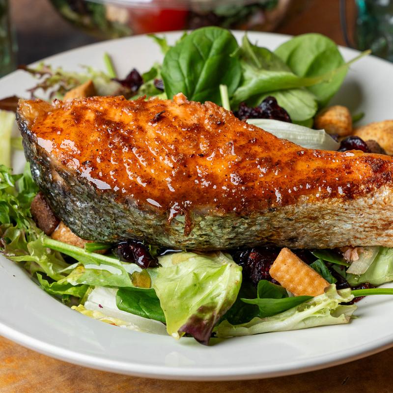 Salmon & kale salad with cookies, water and soda.