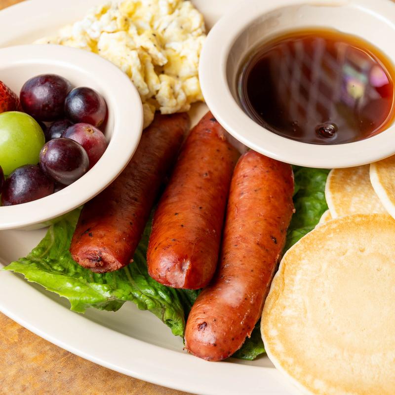 with pancakes & scrambled eggs, and sausage with a side of mixed fruits.