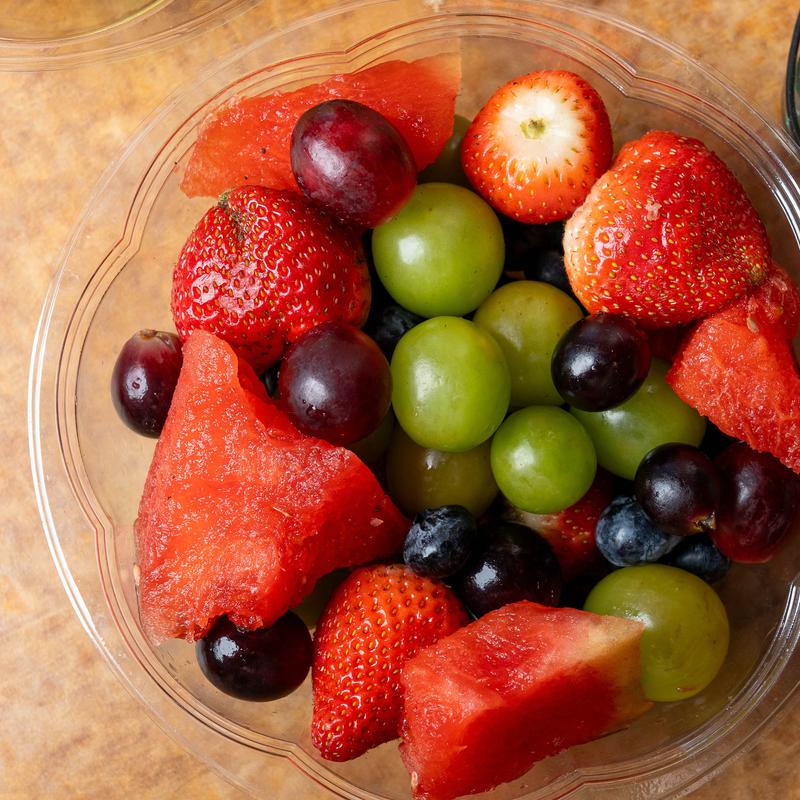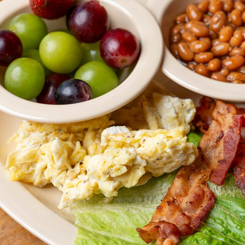 Toasted bread with oatmeal and scrambled eggs, bacon with a side of mixed fruits.